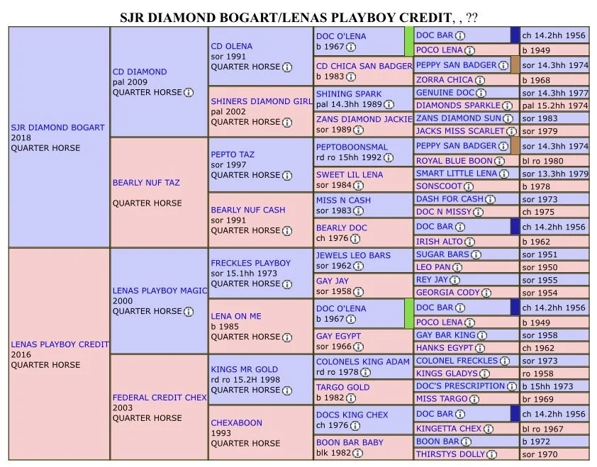 Roxie’s maternal side represents powerhouses in the cowhorse world. Boon Bar Baby was by Boon Bar who was also the sire to Royal Blue Boon, who has long reigned supreme as the all-time leading dam in cutting. Colonels Kings Adam was by Colonel Freckles and Targo Gold was by Doc’s Prescritpion.