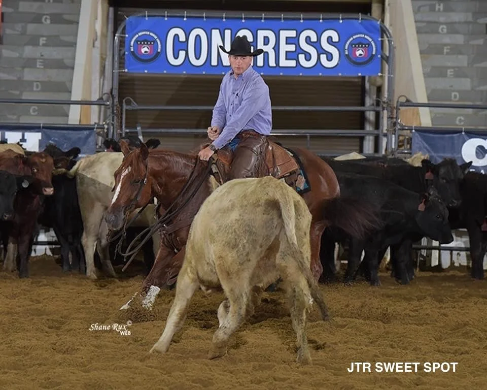 JTR Sweet Spot (Kitty), a stunning mare with over 10K in NCHA earnings. She is by Spots Hot, earner of $529,435 NCHA and sire of earners of over 6 million, including Hottish. Talk about this mare’s bottom side. Kitty’s dam, Sweet Little Kitten, is a FULL sister to High Brow CD (NCHA Horse of the Year), earner of $542,101 with offspring earnings of over $12,700,000. Kitty is a big bodied, strong, athletic mare, between 15.1 and 15.2. She was a competitive force in the cutting pen but injury ended her career. She raised a colt by Woody Be Tuff before we acquired her and gave us a lovely Woody Be Tuff filly last year which we retained. A stud colt by Dual Smart Rey was her third foal.